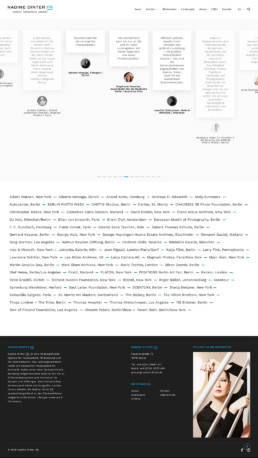 Nadine Dinter PR ist eine inhabergeführte Agentur für Pressearbeit, PR-Beratung und Art Administration. Thematischer Schwerpunkt ist die Fotografie. Die klassische Business-Website präsentiert alle Inhalte in übersichtlicher Form. Die von befreundeten Fotografen aufgenommenen Porträts von Nadine Dinter verleihen der Webpräsenz eine spielerische Leichtigkeit und machen sie zugleich unverwechselbar.
